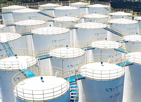 36 خزانًا مخصصًا للمواد الخام (30 للزيت الأساسي بسعة 12000 طن، و6 للمواد المضافة بسعة 100 طن)، متصلة عبر خطوط أنابيب مخصصة بصمامات ومضخات يتم التحكم فيها بواسطة DCS للنقل الآلي إلى غلايات الخلط.